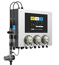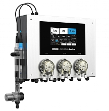 Výkonný elektrolyzér s modulem pro řízení pumpy s variabilním výkonem, s měřením pH a redox potenciálu a integrovanými dávkovacími čerpadly pro regulaci pH a dezinfekce a dávkování algicidu.