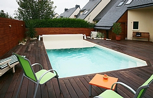 Roleta s kvalitním překrytím z bílého PVC nebo z pevného, elegantního IPE dřeva (65% dřeva a 35% pryskyřice).