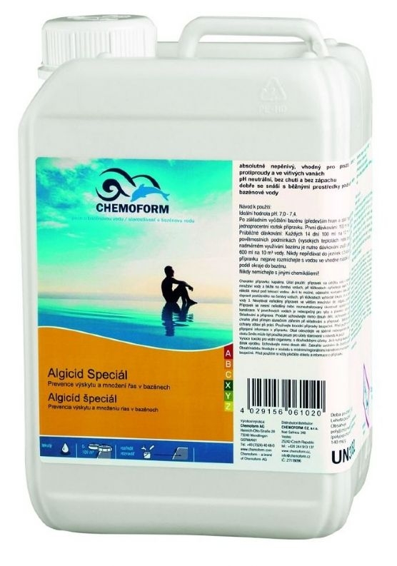 Algicid Speciál (protiřasový přípravek) tekutý nepěnivý. Vhodný do všech typů bazénů včetně protiproudů a atrakcí, whirlpoolů.