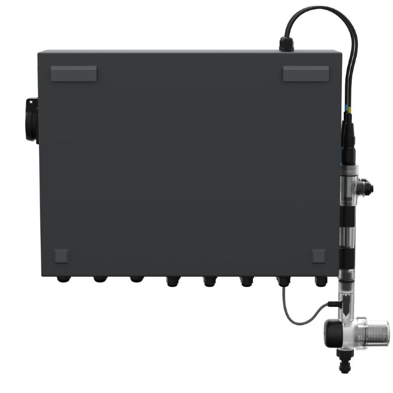 Výkonný elektrolyzér s modulem pro řízení pumpy s variabilním výkonem, s měřením pH a volného chloru a integrovanými dávkovacími čerpadly pro regulaci pH a dezinfekce a dávkování algicidu.