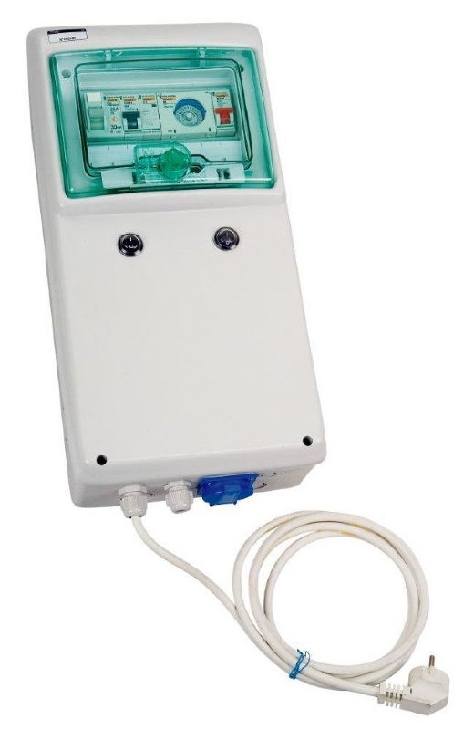 Automatické elektrické ovládací systémy bazénové technologie. F1 s flexo-kabelem - Jednoduchá montáž, bez zásahu do vnitřního zapojení. Připojíte pouze zástrčku filtrace do zásuvky a zástrčku automatiky do zásuvky přivedené pro bazén. Automatika je vybavena proudovým chráničem 30 mA, jištěním motoru filtrace, spínacími hodinami pro časové spínaní doby filtrování, transformátorem 300W. Na přední straně rozvaděče je spínač pro okamžité zapnutí filtrování, například při vysávaní, a spínač světel.
