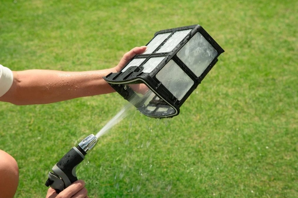 Nečistoty sbírá do vyjímatelného filtračního koše (2 l). Po dokončení cyklu stačí otevřít horní kryt, koš vyjmout, vysypat a opláchnout – hotovo a připraveno na další jízdu.