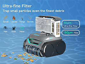WYBOT C2 kombinuje filtrační koš (180 µm) s ultra jemným filtrem (až cca 10 µm), který zachytí i velmi drobné nečistoty. Díky tomu odstraní nejen listí a písek, ale i prach, řasy nebo jemný zákal – výsledkem je viditelně čistší voda.
