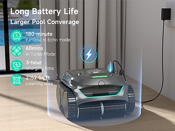 Na jedno nabití zvládne vysavač pracovat až několik hodin (v eco režimu až cca 180 minut), takže bez problémů vyčistí i větší bazény. Ideální řešení pro ty, kteří chtějí kompletní úklid bez přerušení.