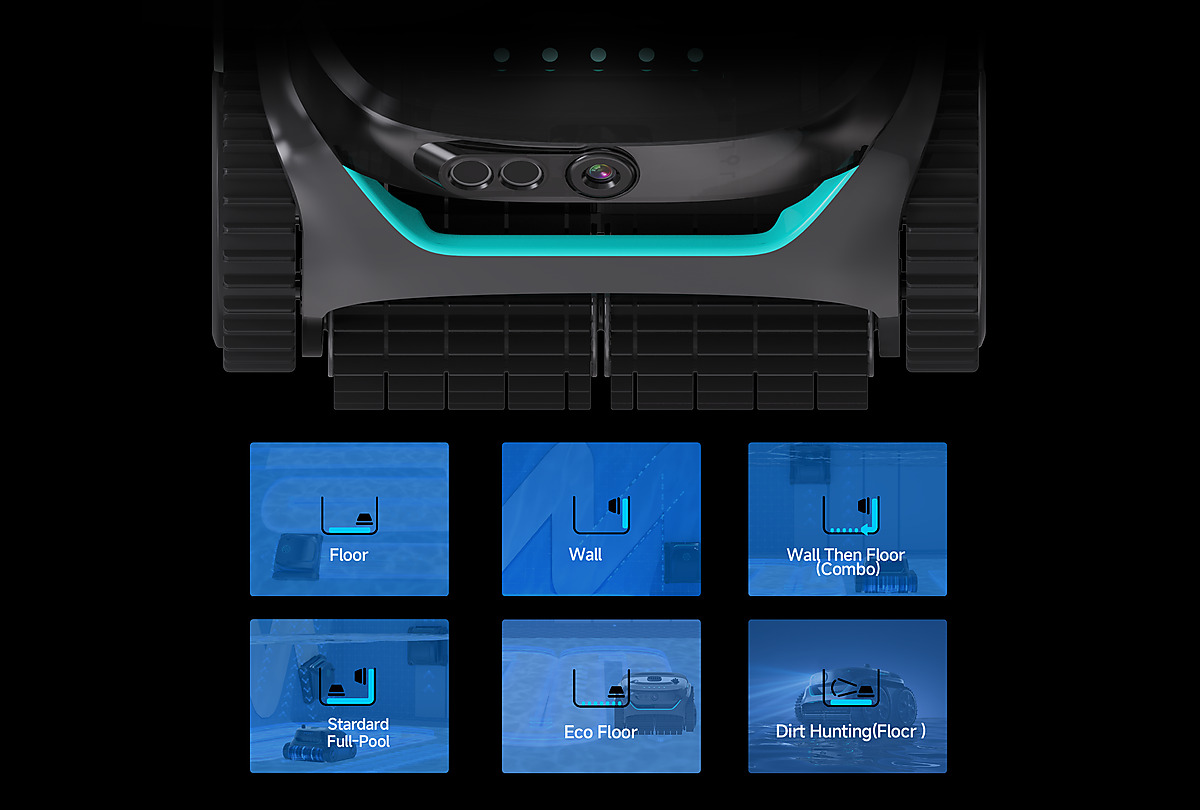 Vyberte si mezi režimy čištění dna, stěn nebo kompletního cyklu. Nechybí ani inteligentní režimy jako ECO nebo cílené čištění znečištěných míst.