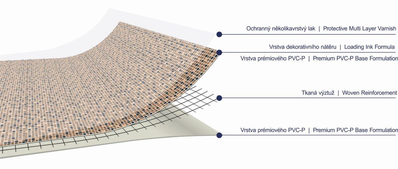 Fólie pro vyvařování bazénů. Dvě vrstvy prémiového PVC-P, vyztužena polyesterovým pletivem. Tisk vzorů pod vysoce kvalitním ochranným lakem. Tloušťka materiálu 1,5 mm.