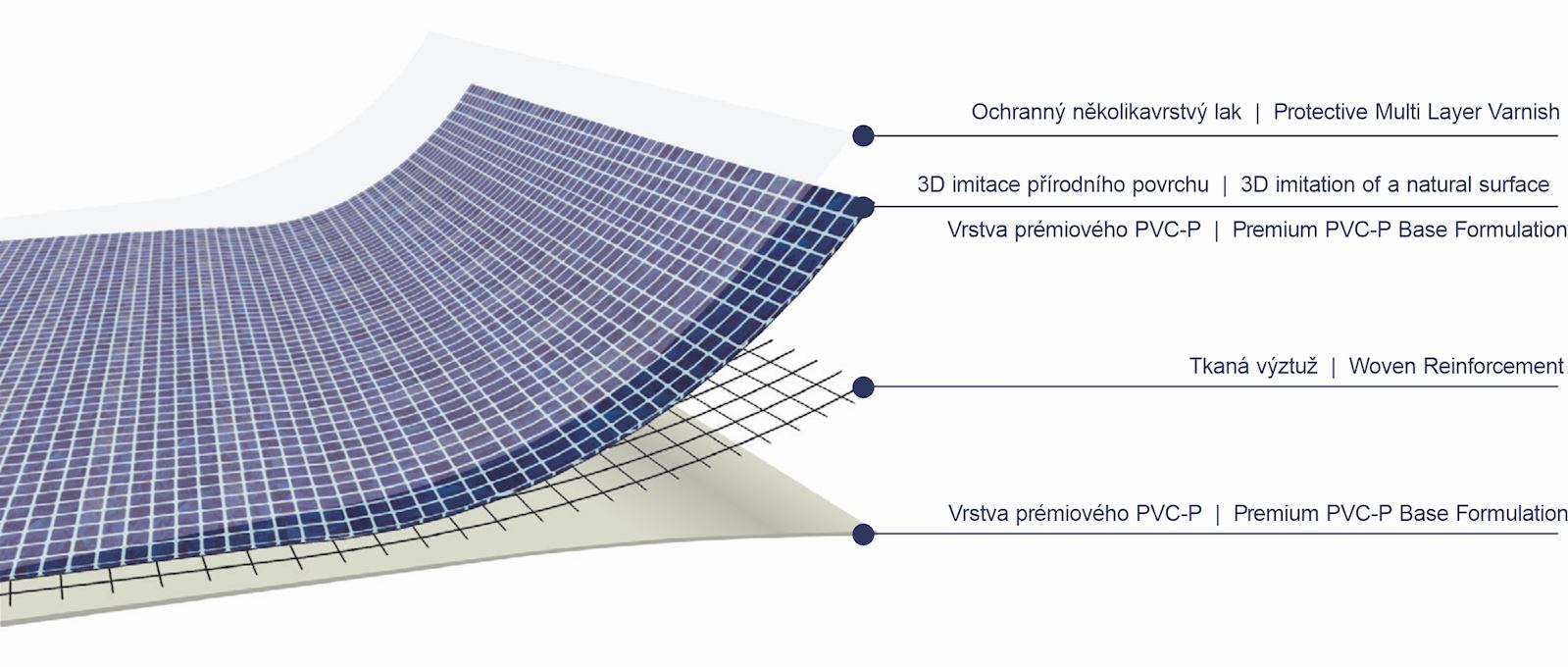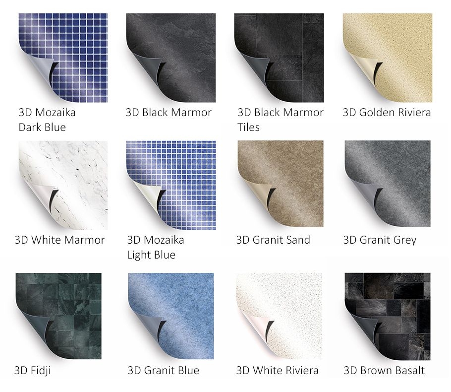 Luxusní fólie pro vyvařování bazénů. Dvě vrstvy prémiového PVC-P, vyztužena polyesterovým pletivem. Strukturované vzory pod vysoce kvalitním ochranným lakem. Tloušťka materiálu 1,6 mm.