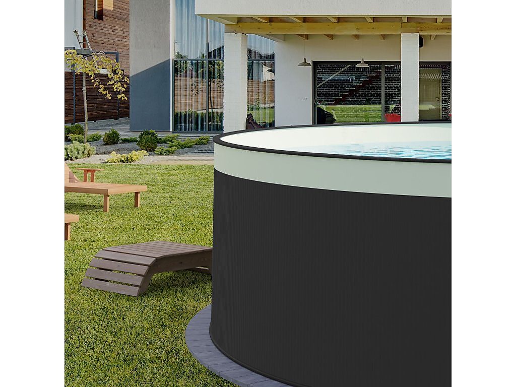 Moderní antracitové provedení stěny v kombinaci s BÍLOU fólií dodává bazénu čistý a nadčasový vzhled, který se hodí do každé zahrady.