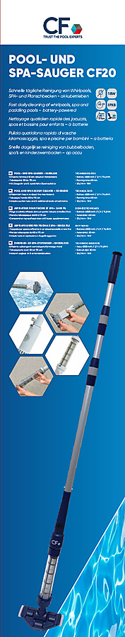 Ruční bazénový vysavač CF 20 AKU je praktickým pomocníkem pro každého, kdo chce udržovat svůj bazén nebo vířivku čisté bez zbytečné námahy a bez kabelů. Díky bezdrátovému provedení a automatickému spuštění při ponoření do vody je jeho použití maximálně pohodlné a intuitivní.