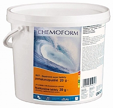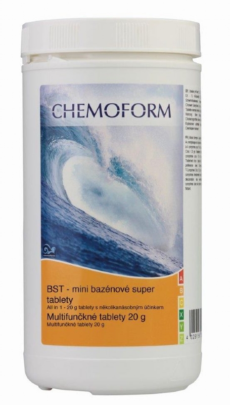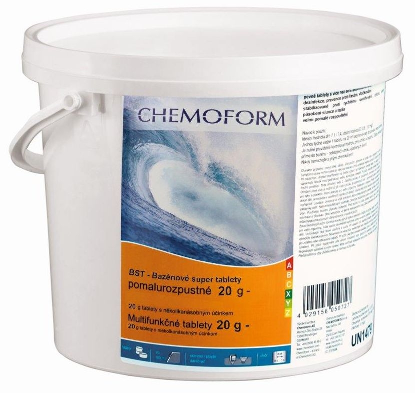 Organické tablety 20 g. Bazénová Super Tableta je pomalu rozpustný stabilizovaný chlórový přípravek vhodný pro preventivní dlouhodobou údržbu bazénové vody, ničící zárodky a bakterie. Flokováním odstraňuje jemné nečistoty a brání tvorbě řas. Vhodné zejména pro dlouhodobé a preventivní ošetřování průzračné bazénové vody.