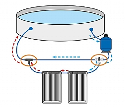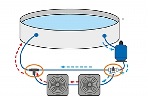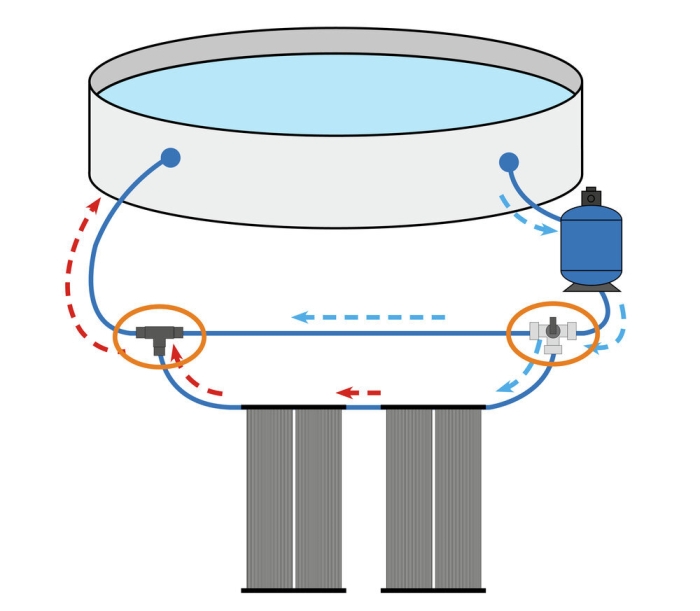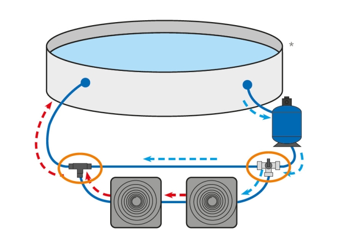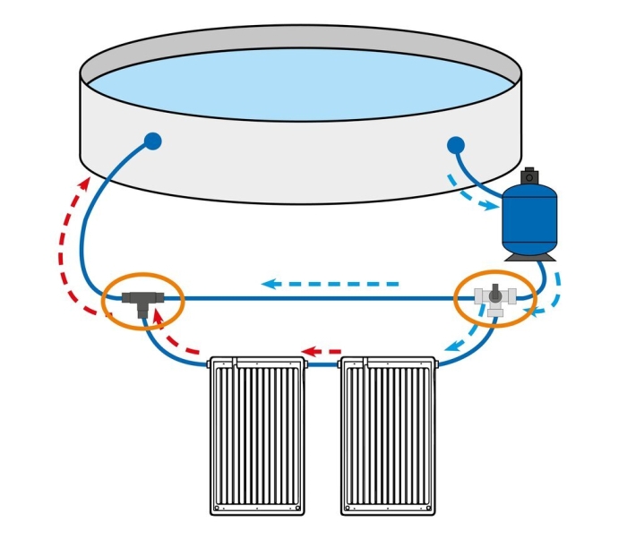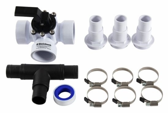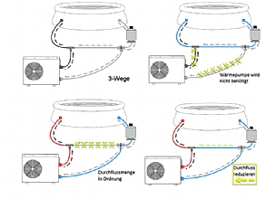 Průtok vody můžete cíleně regulovat pomocí třícestného ventilu. To je vhodné zejména při použití k regulaci tepelného výkonu solárními jednotkami nebo tepelnými čerpadly. Sadu lze použít s bazénovou hadicí o průměru 32 nebo 38 mm.