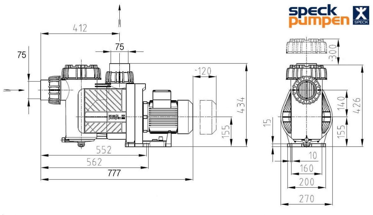 Ideální pro privátní bazény, sání: 110mm, výtlak: 110mm, krytí motoru: IP 54, otáčky: 2840 ot./min, hlučnost: 55dB