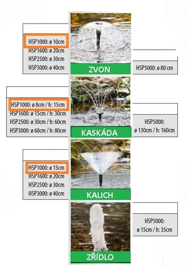 | 3 vodní efekty | vodní zvon, kalich, kaskáda |