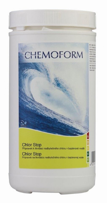 Při náhlém vysokém předávkování chlóru hrozí vybělení stěn bazénu či poškození jeho kovových částí. Proto je třeba v co nejkratší době snížit množství chlóru v bazénu. Přípravek Chlor Stopp reaguje okamžitě.
