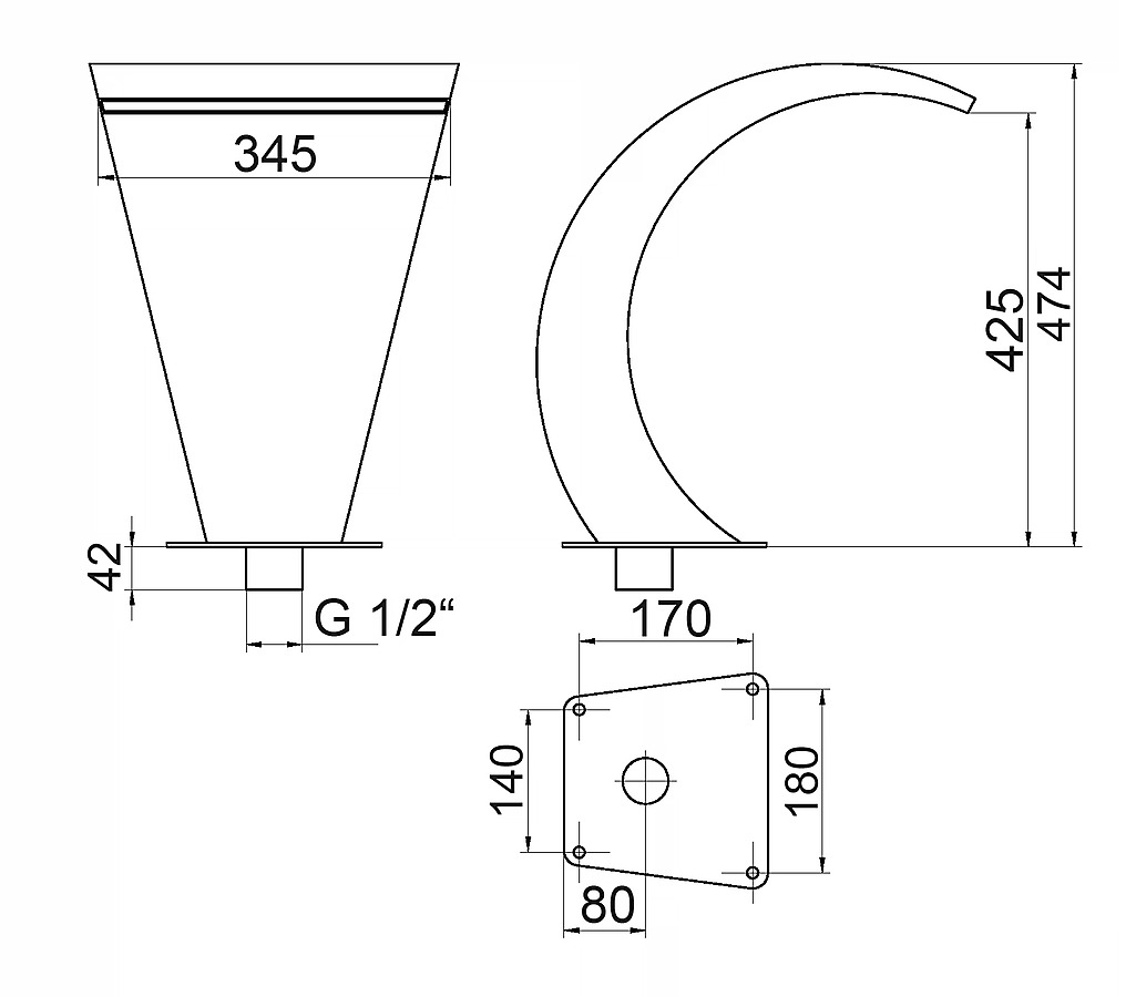 Vodní chrlič. Materiál nerez AISI 316L. Napojení 1 1/2 "in. Rozměry (š / v / h): 345 x 474 x 170 mm