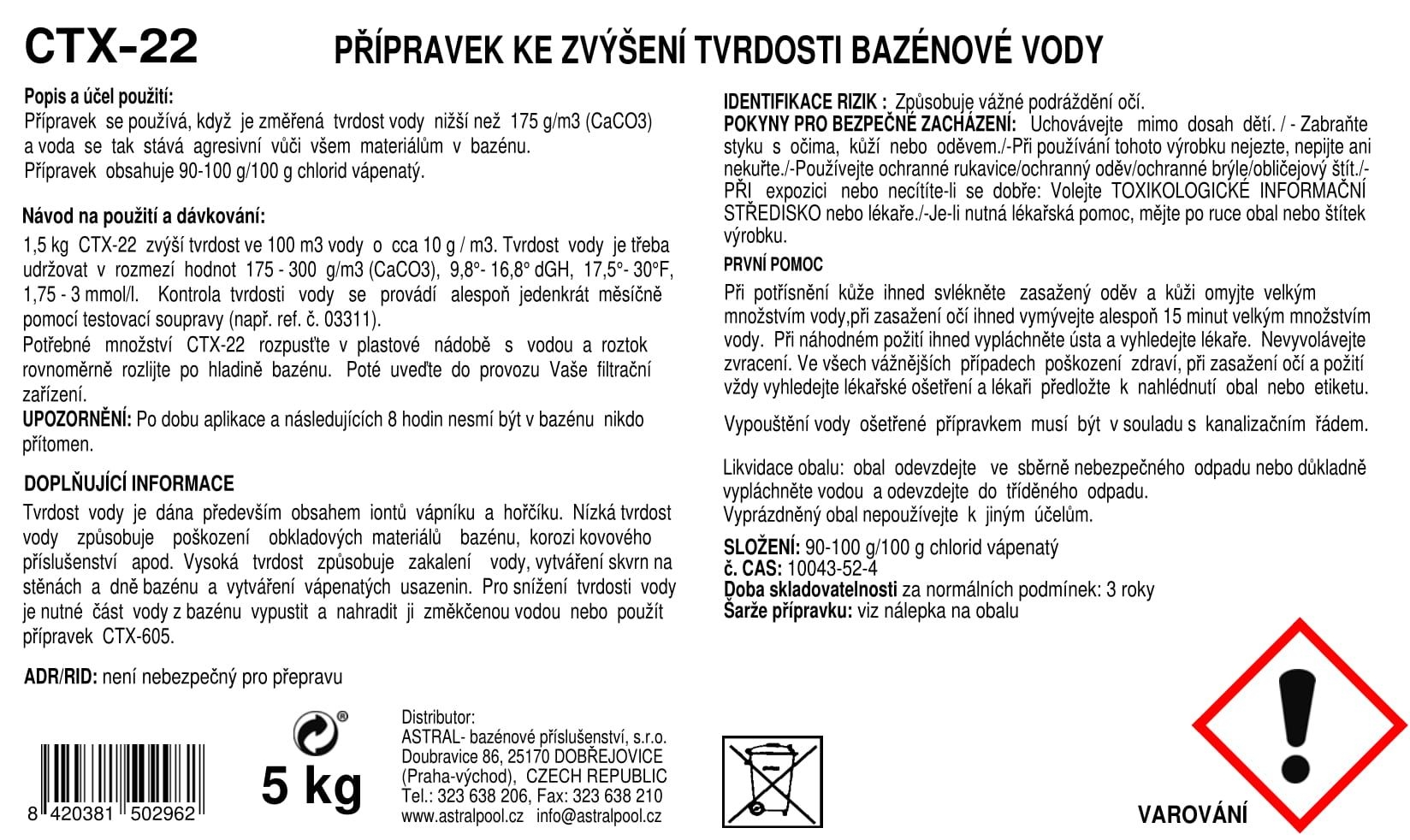 150 g CTX-22 zvýší celkovou tvrdost o cca 10 g/m3 v 10 m3 vody.