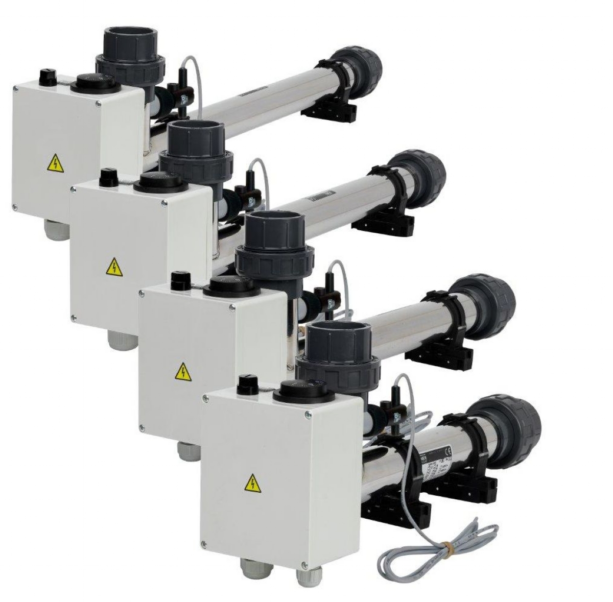Elektrické průtokové ohřívače jsou určeny k ohřevu vody v bazénech a vířivých vanách, činnost spočívá v ohřevu protékající vody tělesem topení, teplota ohřívané vody je nastavena regulačním termostatem. Topné těleso je spínáno stykačem, který je ovládán výše uvedeným termostatem, bezpečnostním indikátorem průtoku. Z tohoto důvodu je k topení nutná tzv. velká automatika - 24 hodinový programátor filtrace, proudový chránič (ochrana před nebezpečným dotykovým napětím), tepelná ochrana motoru, stykač a spínač topení.