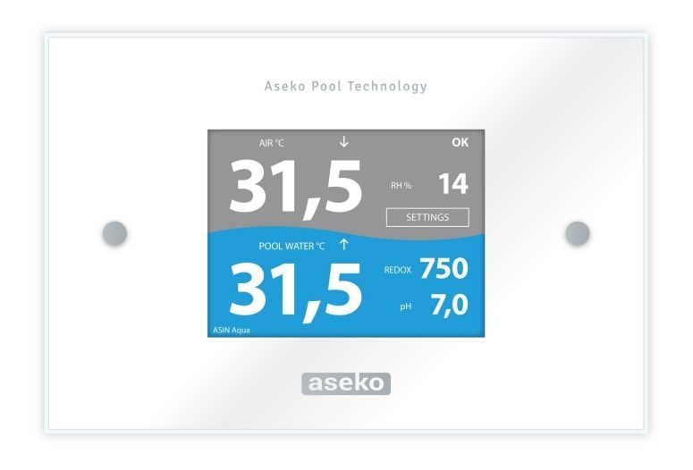Designový informační displej zobrazuje teplotu a relativní vlhkost vzduchu v prostoru bazénu, pH, koncentraci dezinfekce a teplotu bazénové vody. Displej je připojitelný k ASIN AQUA Profi. Provedení nerez sklo. LED displej s vysokou svítivostí.