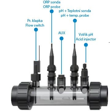 - Vestavěné senzory pH, ORP, teploty a průtoku