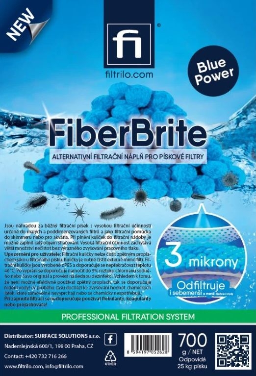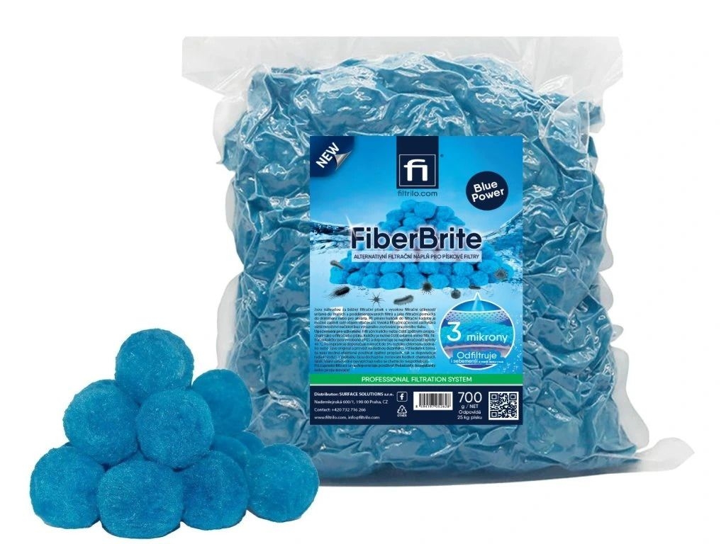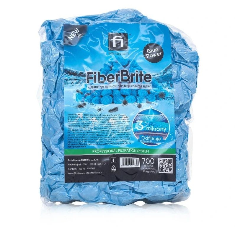 FIBER BRITE BLUE POWER je jediné certifikované filtrační médium pro pitnou vodu a extra čistou bazénovou vodu. Filtrační kuličky FIBER BRITE BLUE POWER jsou náhradou za běžný filtrační písek s vysokou filtrační účinností. Dokáží odfiltrovat částice až do velikosti 3 mikronů (písek pouze 20mikronu) Při plnění kuliček do filtrační nádoby je možné zaplnit celý objem bez stlačování. Vysoká filtrační účinnost zachytává větší množství nečistot bez výrazného zvyšování pracovního tlaku. Proto se doporučuje pravidelná kontrola stavu a čištění filtračních kuliček.