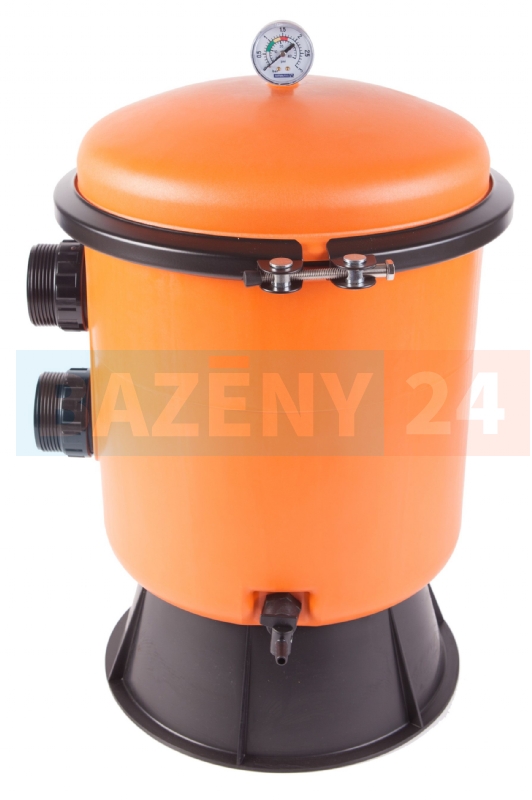 Okraje obou částí filtru zesíleny, manometr, vypouštěcí a odvzdušňovací ventil součástí.