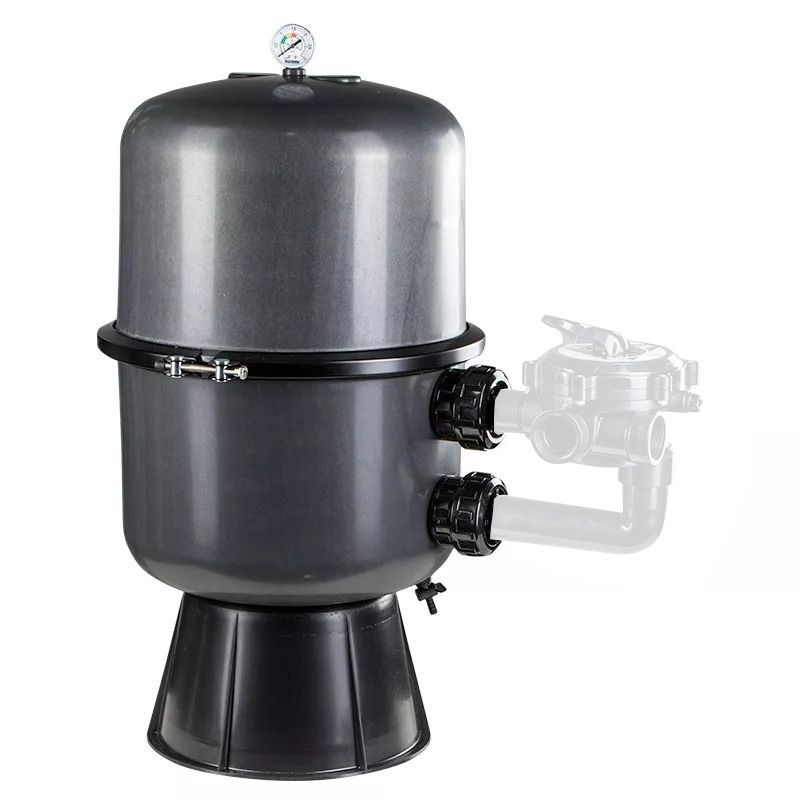 Dvoudílná filtrační nádoba z polypropylenu vyztuženého skelným vláknem (PP). Velmi robustní a odolná vůči UV záření. Polypropylen je odolný téměř vůči všem chemikáliím používaným v bazénech (kromě ozonu). Obě poloviny filtrační nádoby jsou pevně utěsněny nerezovou svorkou. Díky rozdělenému designu a snadnému otevření filtrační nádoby je výměna písku velmi snadná.