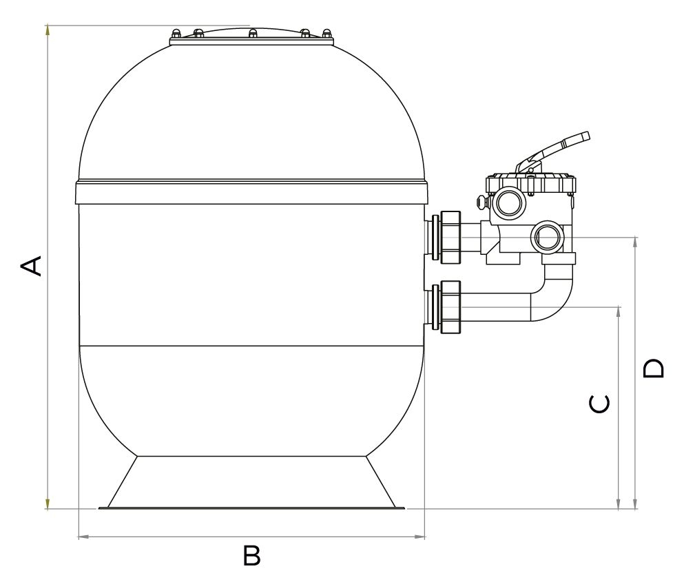 Filtrační nádoba s šesticestným bočním ventilem. Vyztužený sklolaminát s UV povrchovou úpravou. Vyrobeno v EU. Průměr nádoby 750 mm. Množství náplně 300 kg.