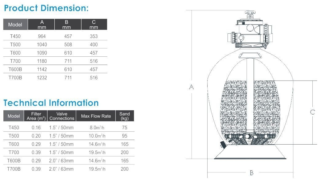 Průměr 600 mm, dvojitá filtrační růžice pro lepší filtrování. Náplň 165 kg písku.