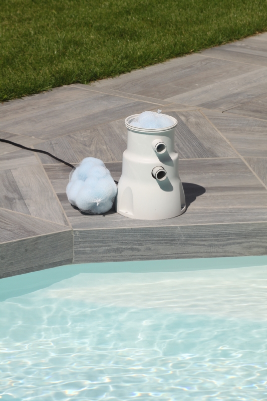 Vnitřek vláknité koule tvoří hustší jádro a měkčí obal. Záměrně zvolený sférický tvar vytváří největší možný filtrační povrch a zároveň umožňuje optimální a flexibilní přizpůsobení různým tvarům filtrů. Proto je ideální také do automatických bazénových vysavačů, kde se rovnou vloží do filtračního koše vysavače, ale i ostatních typů bazénových vysavačů.