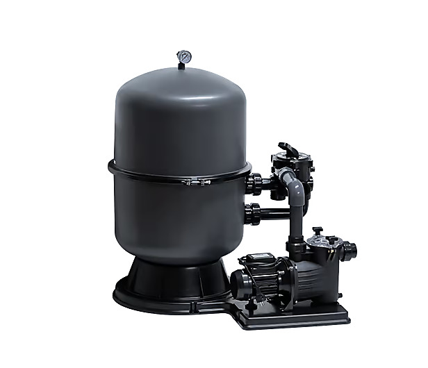 Kompletní filtrační sestava složená z dělené filtrační nádoby Bilbao 500 se šesticestným bočním ventilem a manometrem, propojenou potrubím o průměru 50 mm s čerpadlem Preva. Celá filtrace je umístěna na paletě.
