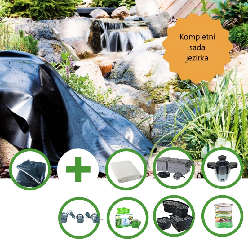 Sada pro výstavbu okrasného jezírka obsahuje jezírkovou fólii, ochranou jezírkovou geotextilii pod fólii, jezírkovou průtokovou filtraci dimenzovanou na chov ryb, včetně filtračních médií, bio domečky pro osídlení jezírkovými bakteriemi, filtrační houby pro hrubé nečistoty, regulovatelné čerpadlo s nízkou spotřebou, UV lampu proti tvorbě řas, hadicové přípojky na propojení čerpadla s filtrací a jezírkovou hadici. Dále roční sadu přípravku, obsahující úpravu vody, která reguluje tvrdost a pH vody, aby správně fungovali jezírkové bakterie odstraňující živiny z vody, druhá složka jsou právě jezírkové bakterie. Obsahuje 10 sáčků což stačí na pokrytí celé sezóny. Jezírkové osvětlení možné použít ve vodě i mimo, včetně výměnných barevných sklíček, pro změnu barvy osvětlení. Sázecí koše na vodní rostliny. Návod s návrhem na vybudování jezírka.