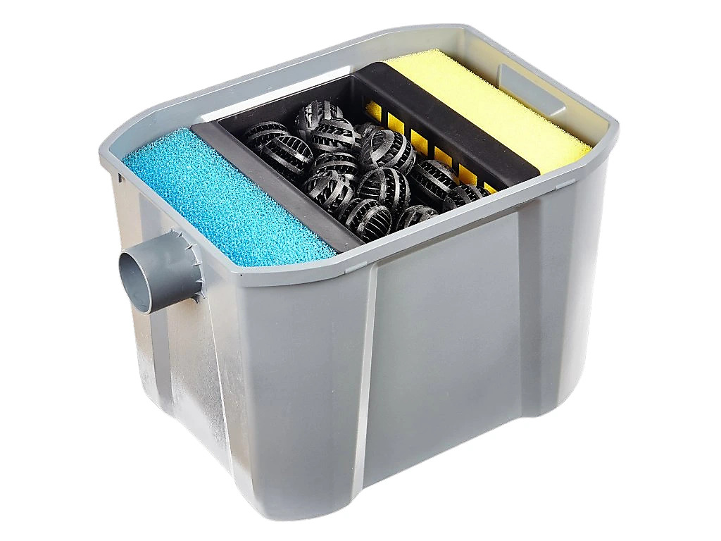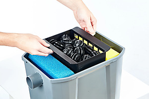 Set obsahuje výkonné filtrační čerpadlo s integrovanou UV-C lampou 9 W, která aktivně omezuje růst řas a mikroorganismů. Předčištěná voda je nasávána čerpadlem a následně prochází třemi komorami filtru, kde dochází k mechanickému i biologickému čištění. Filtraci zajišťují jak filtrační houby s různou hrubostí, tak 50 filtračních koulí, které podporují biologickou čistotu vody.