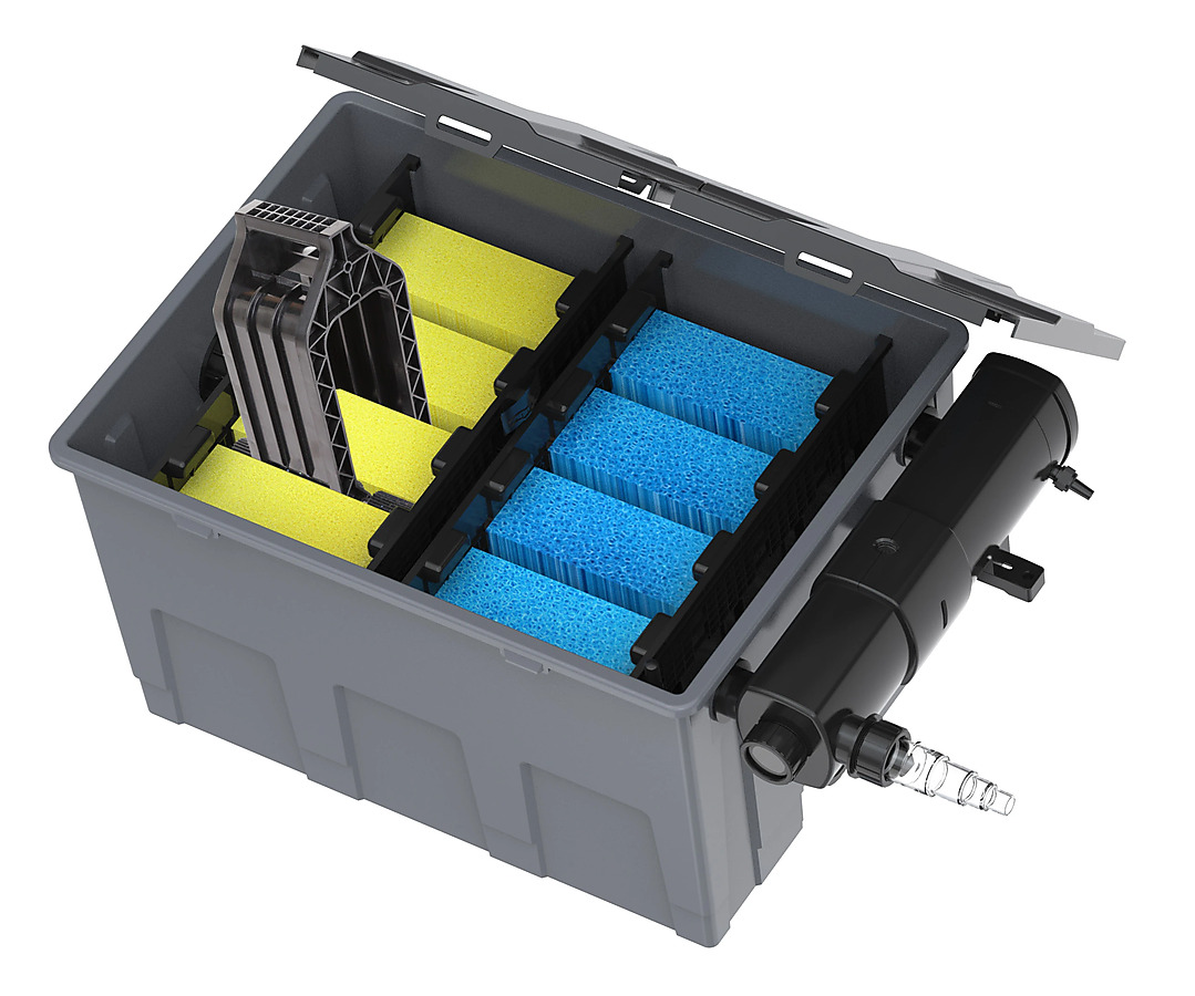 - Filtrační média: pěnové vložky a biomedium pro biologickou filtraci