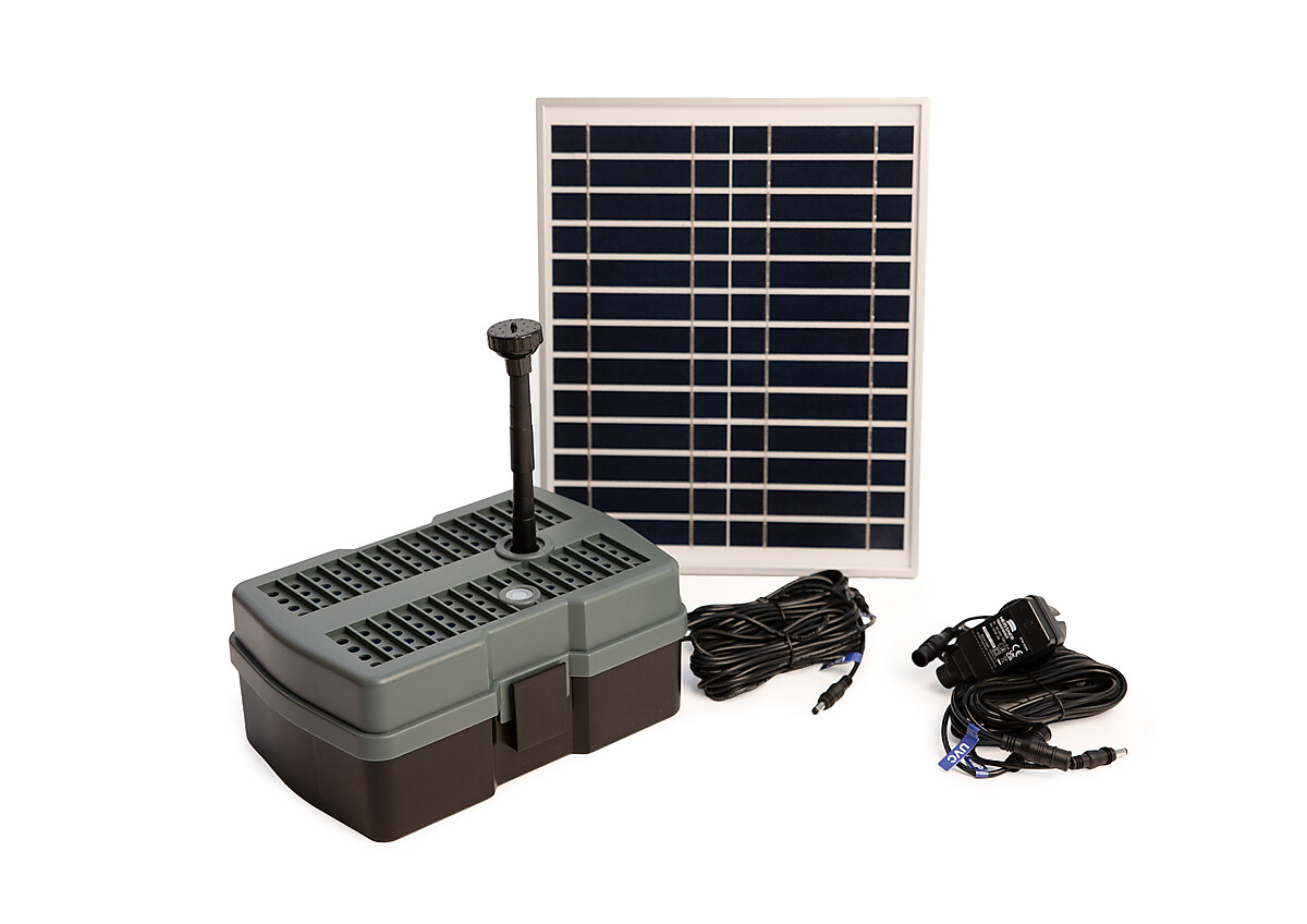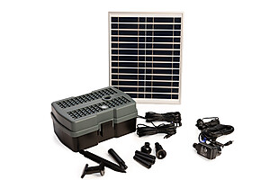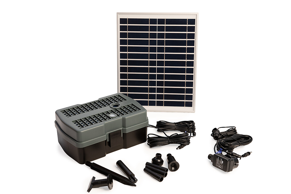 Je určeno pro jezírka do 1000 l. Podvodní filtrace s čerpadlem a integrovanou UV lampou 5 W pro ti řasám. Na těle filtrace je průzor pro kontrolu UV lampy. Celoplošný filtrační povrch s mechanickou filtrací zaručuje prodloužení intervalu mezi nutnou údržbou. Žádná část filtrace prakticky není vidět díky umístění na dně jezírka. Sada čerpadla s filtrem obsahuje teleskopickou trubici a dvě trysky pro vodni efekty. Je osazena filtračními médii, filtračním molitanem pro hrubé nečistoty, bio domečky pro usídlování filtračních bakterií pro biologickou filtraci. Díky solárnímu panelu máte za slunných dní provoz zcela zdarma, ale je i možnost díky dodávanému trafu zapojit filtraci i do elektrické sítě.