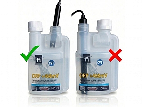 Hodnota ORP je definována při 25 °C (77 °F) a etiketa uvádí také teplotní závislost, což usnadňuje korektní kalibraci i mimo standardní teplotu. Pro zachování přesnosti je nutné roztok použít pouze jednorázově. Stlačením lahvičky naplňte integrovanou odměrnou dávkovací komůrku a do ní ponořte testovací sondu. Po vložení sondy dojde ke zvýšení hladiny (počítejte s tím). Elektroda/senzor musí být ponořen(a) tak, aby hladina roztoku byla nad aktivní částí měřicího prvku. Po použití roztok vylijte do odpadu. Použitý roztok nikdy nevracejte zpět do originálního obalu.