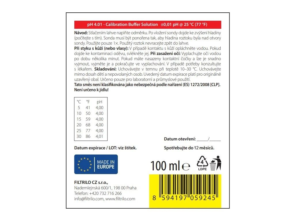 Doporučení pro praxi: pH 4.01 lze použít samostatně pro jednobodovou kalibraci nebo jako součást vícestupňové kalibrace (typicky pH 4.01 / 7.00 / 10.01) pro maximální přesnost v širším rozsahu měření.