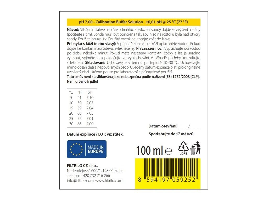 Doporučení pro praxi: pH 7.00 lze použít samostatně pro jednobodovou kalibraci nebo jako součást vícestupňové kalibrace (typicky pH 4.01 / 7.00 / 10.01) pro maximální přesnost v širším rozsahu měření.