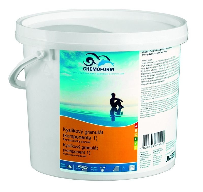 Kyslíkový granulát O2 bez obsahu chlóru. Tento kyslíkový přípravek je vhodný stejně jako u chlorových tablet pro likvidaci bakterií a zabraňuje tvorbě řas. Je nezbytné jej doplnit použitím přípravků O2, popřípadě flokulačními tabletami Flokulant (pro zvločkování drobných nečistot).