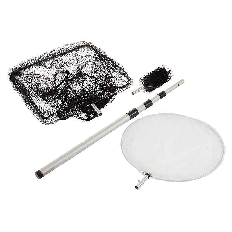 Sada na čištění jezírka s obdélníkovou a kulatou síťkou obsahuje násadu z eloxovaného hliníku. Hodí se k celoročnímu použití. Již pár teplých letních dnů stačí k masivnímu zvýšení růstu řas v zahradním jezírku. Pro plovoucí listí a řasy použijete nástavec s jemným síťováním o průměru 36 cm. Pro odstranění vláknitých řas použijete nástavec s kartáčem. Sada obsahuje teleskopickou násadu 55-150 cm.