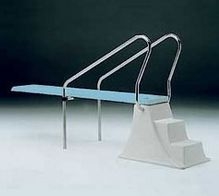 Skákací prkno se schůdky. Boční madla z nerezové oceli. Pro soukromé bazény. Délka 2,5 m, šířka 0,46 m.