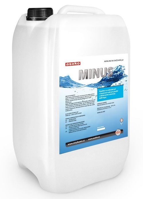 pH minus je kapalina pro snižování pH bazénové vody. Pro vodu s běžnou alkalitou sníží 30 ml kapaliny v 1 m3 vody pH o 1. Tato hodnota je průměrná a může se lišit. Při používání pro dávkování s automaty ASIN Aqua se řiďte vždy příslušným návodem.