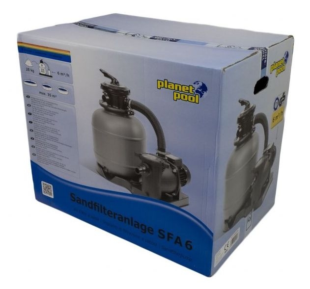Písková filtrace je srdcem každého bazénu, které zajišťuje, aby voda v bazénu byla kvalitní a krásně čistá. Filtrace SFA 6 je určená pro bazény s objemem do 35 m3. Filtrační nádoba je vyrobena z kvalitního polypropylenu, pojme 20 kg filtračního písku a odolává korozi a běžné bazénové chemii. Filtrace má výkonné čerpadlo o výkonu 400W a je vybavena předfiltrem hrubých nečistot, ve kterém se zachytí všechny větší nečistoty. Součástí filtrační nádoby je praktický vypouštěcí ventil. Hlava filtrace je vybavena 6cestným ventilem, tělo filtrace je usazeno na stabilní základně. Díky silnému čerpadlu je filtrace vhodná pro uživatele, kteří potřebují do filtračního okruhu připojit bazénové příslušenství (např. solární ohřev, vysavač). Filtrace je určena pro venkovní použití a je odolná proti povětrnostním vlivům.