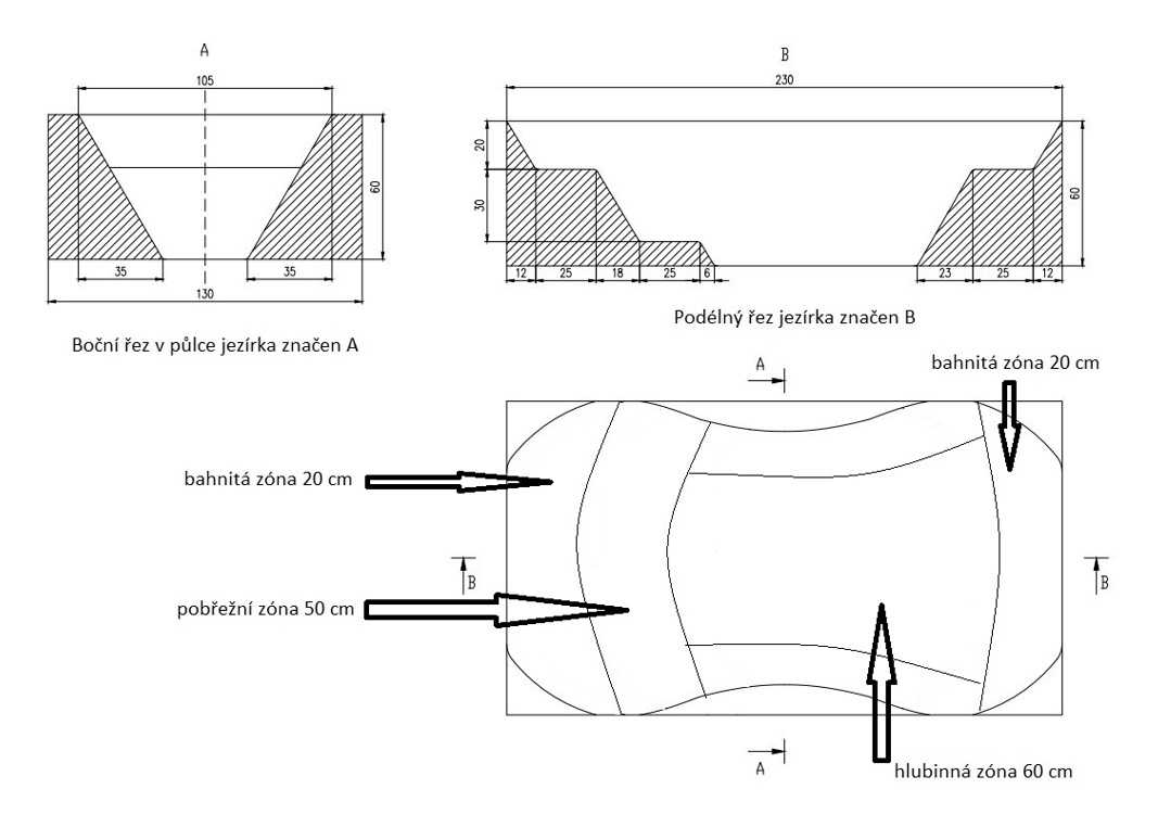 Na vybudování jezírka můžete použít náš návrh jezírka, který je přizpůsoben pro co největší koupací zónu, nebo si ho můžete libovolně přizpůsobit dle možností místa ve Vaší zahradě a dle vašeho požadavku. Je jen zapotřebí nepřekročit maximální rozměr, který je určen rozměrem jezírkové fólie a to 1,3 x 2,3 x a do hloubky 0,5 m.