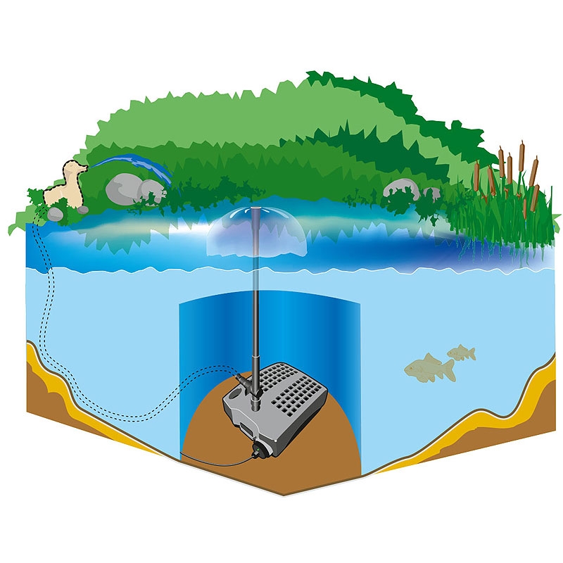 Filtrace je vybavena 10 metrovým přívodním kabelem, teleskopickou stupačkou se třemi vodními efekty, přípojkou na vodní chrlič, 9 W UV lampou proti řasám. Filtraci skrytě umístíte přímo do jezírka, doporučujeme umístit na cihly, nebo kámen a pokud možno vodorovně (prodloužíte životnost čerpadla, osičky a rotoru)