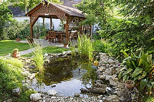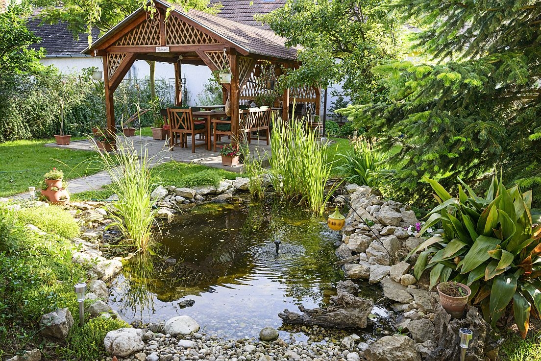 Po vyrovnání fólie můžete zasadit rostliny v sázecích košíkách a usadit techniku. Jezírko naplňte vodou z vodovodu či studny. Po 24 hod. odstřihněte přečnívající fólii. Vytvořený žlábek vyplňte kameny, které upevní folii a zamezí vzlínání vody (kapilárnímu efektu).