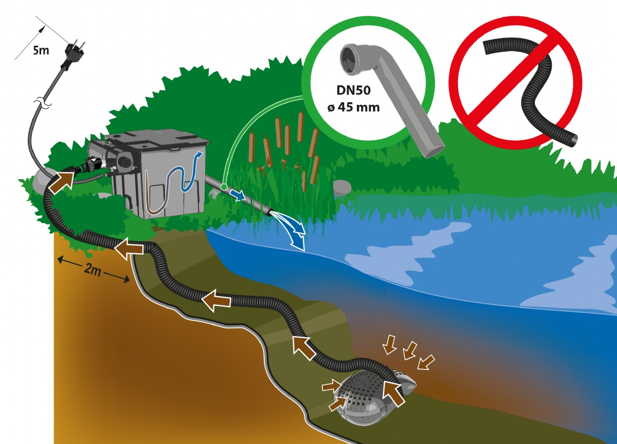Filtrace je vybavena 10 metrovým přívodním kabelem, teleskopickou stupačkou se třemi vodními efekty, přípojkou na vodní chrlič, 9 W UV lampou proti řasám. Filtraci skrytě umístíte přímo do jezírka, doporučujeme umístit na cihly, nebo kámen a pokud možno vodorovně (prodloužíte životnost čerpadla, osičky a rotoru)