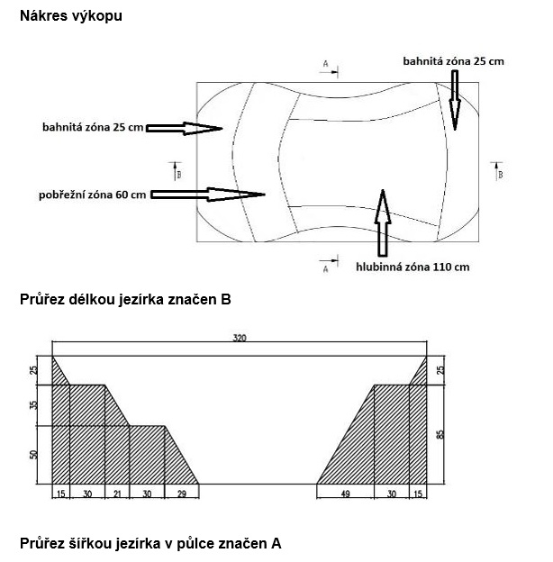 Na vybudování jezírka můžete použít náš návrh jezírka, nebo si ho můžete libovolně přizpůsobit dle možností místa ve Vaší zahradě a dle vašeho požadavku. Je jen zapotřebí nepřekročit maximální rozměr, který je určen rozměrem jezírkové fólie a to 2,2 x 3,2 a do hloubky 1 m.