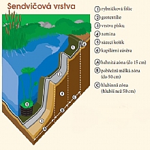 Naneste na všechny vodorovné plošky 10 cm vrstvu písku. Vyrovnávejte vodováhou a latí. Potom tuto jámu vyložte geotextilií. Fólii položte do středu jámy a odtud začněte s vyskládáním fólie. Nakonec fólii přetáhněte přes okraj a vytvořte kapilární závěru (žlábek vyplněný oblázky, okrasným štěrkem zabrání vzlínání vody z překladů fólie.)