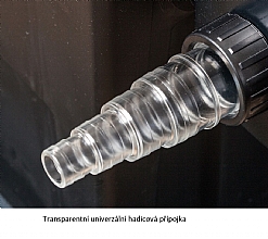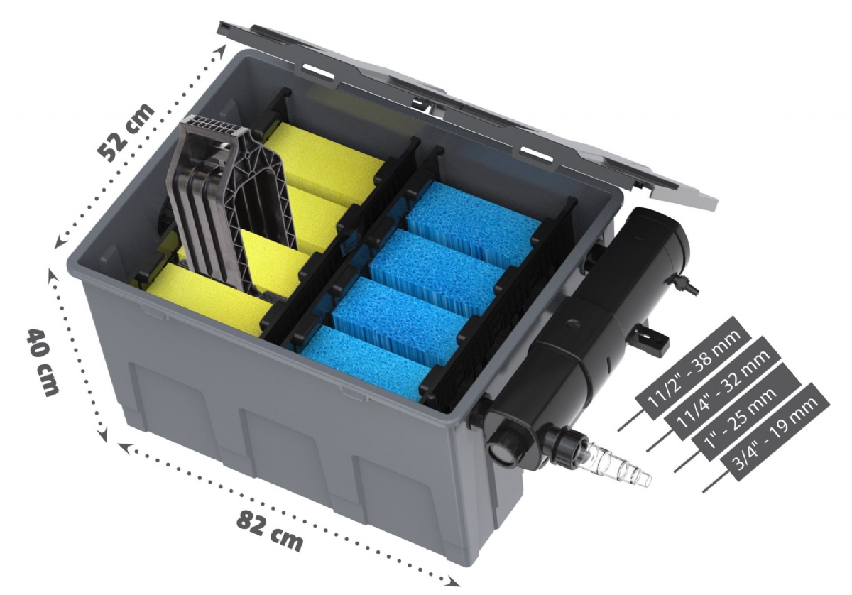 Sada obsahuje: výkonné regulovatelné filtrační čerpadlo (přepravuje nečistoty až do průměru 6 mm), UV lampou proti tvorbě řas (24 W), 5 m připojovací hadicí (25 mm), a filtrační média (filtrační houby různé hrubosti, japonská rohož, domečky pro osídlení bakteriemi).