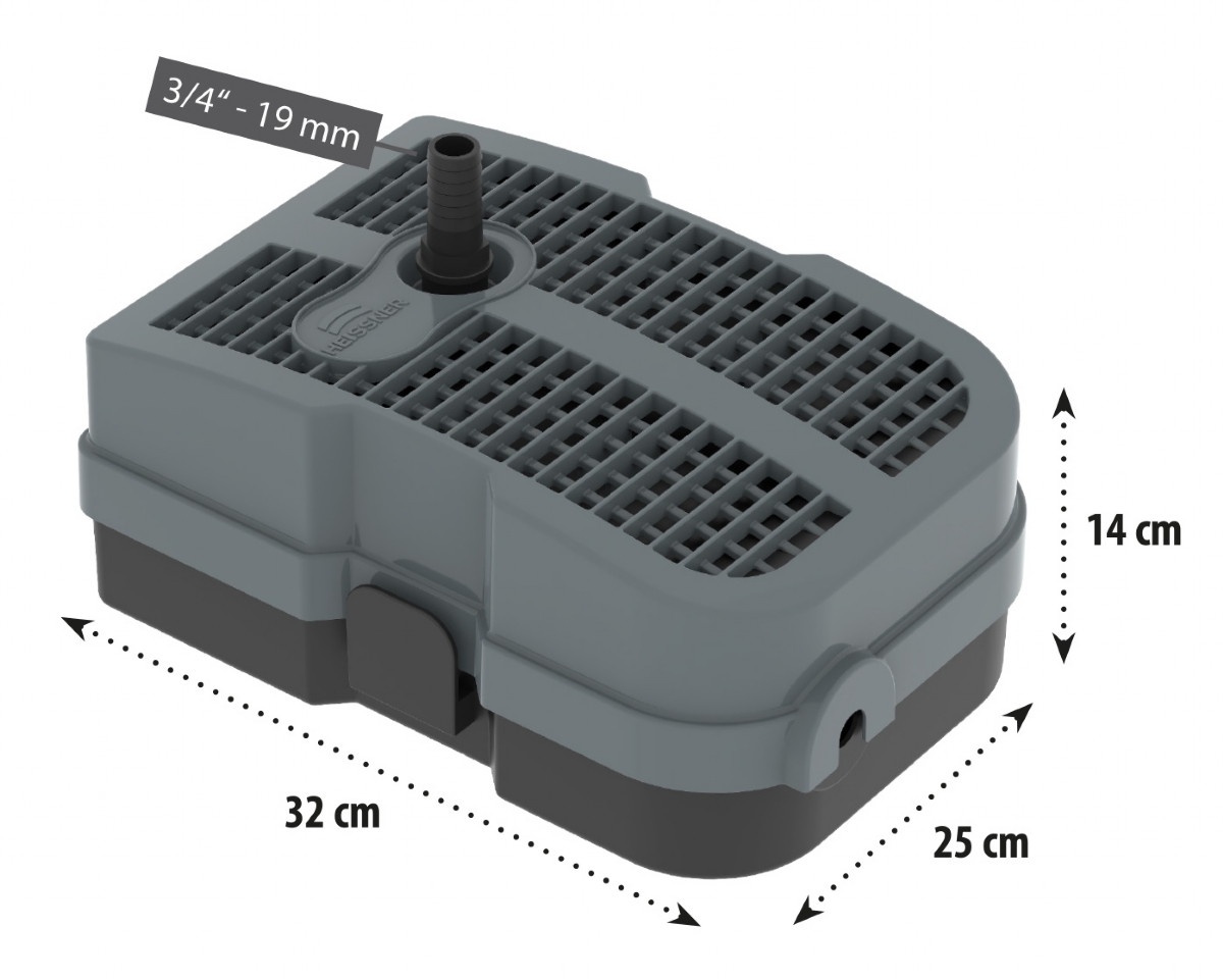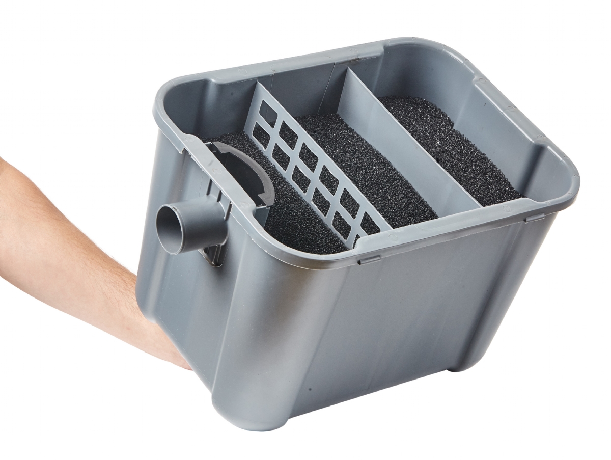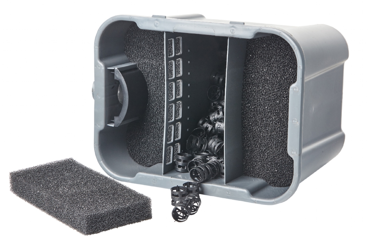 Sada obsahuje: čerpadlo s integrovanou UV lampou, filtrační nádobu, včetně filtrační houby a lava granulátu, hadici na propojení 3 m (19 mm), příslušenství na zapojení